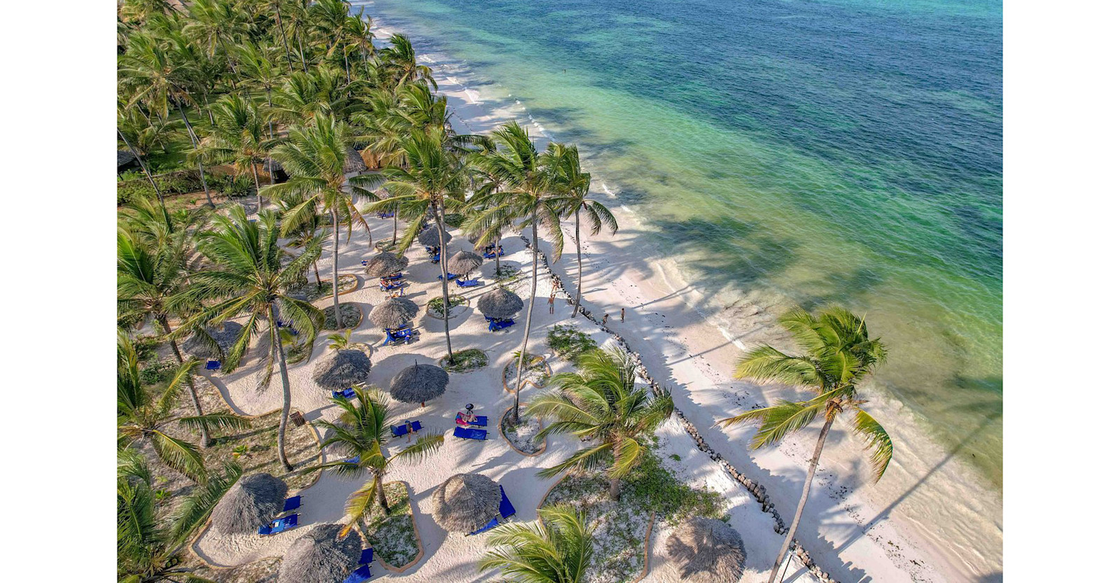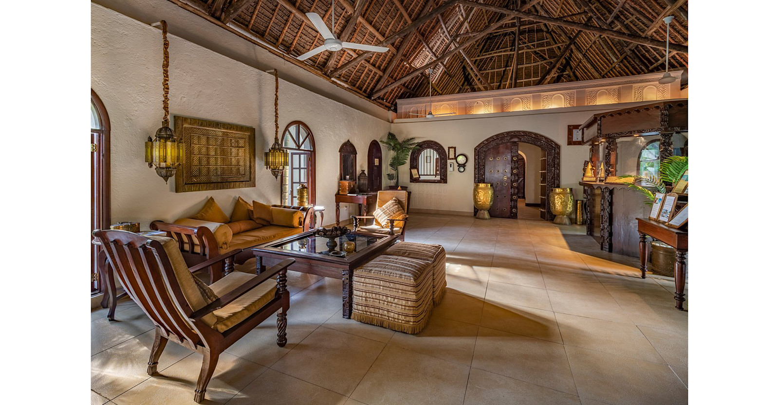 Situated on the island’s secluded southeastern coast, this 5-star hotel blends traditional Zanzabari design and decor with modern aesthetics. The expansive lobby features open-air rooms with Makuti roofs, interconnected by covered passageways. Relax in any of the multiple seating areas with local handmade wooden furniture under suspended brass lanterns. The hotel’s lush grounds include palm trees and manicured tropical gardens bisected by paved pathways that lead to a large outdoor pool.