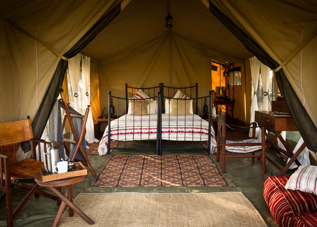 Kimondo is a small mobile tented camp that tracks the seasonal migration of wildebeest from the Lamai Wedge and Mara River in winter to the southern Serengeti grasslands in the height of summer. Constructed of wood and canvas in an exotic blend of vintage East African safari style with subtle Moroccan overtones, Kimondo has eight elegant and airy canvas tents, each with a king-size cast-iron bed, leather folding chairs, wooden writing desk, and en suite bathroom with flush toilet and safari-style shower and private veranda. The central area features a spacious lounge with wooden daybeds, plush cushions and a common dining tent. Before or after dinner, guests can reminisce about the day’s sightings over drinks around the campfire.