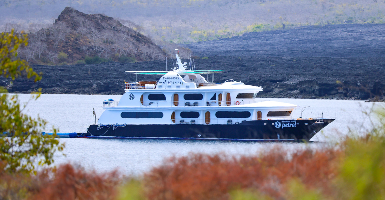 The luxurious 115-foot Natural Habitat Petrel is named after a seabird common to the Galapagos. Like its namesake, Petrel is elegant and swift at sea. This motorized catamaran is designed for comfort and stability while conveying guests in style between the islands of the Galapagos. Eight large staterooms, including two suites, accommodate up to 16 guests. Cabins have varied configurations with either two full beds that can convert to one king bed. Each has a private balcony, ample closet storage, en suite bathroom. An additional ninth cabin offers cozy single accommodations. Interior decor is as clean and contemporary as the ship's exterior profile, featuring a palette of nautical blue. Chrome, leather and glossy teak floors accentuate the modern design. An open top deck offers 360° views, while a spacious lounge provides room to relax in the air-conditioned interior. Enjoy fine meals in the dining room or on the aft deck. Two bars offer outdoor refreshments, and a Jacuzzi rounds out the ship's offerings.