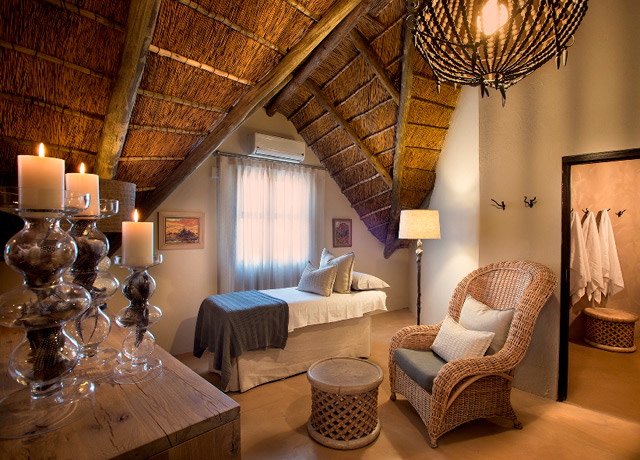 The main house, which rests at the foot of the Korannaberg Mountains, is comprised of local stone, red clay, and Kalahari thatch, evoking the influences of nature and local culture. Inside is a lounge, dining area, mezzanine library, a museum of local artifacts, wine cellar, spa, and gym. Across from the shimmering, heated swimming pool are six suites and three family suites, each accommodating up to four guests. The suites consist of a generously sized bedroom and bathroom with indoor and outdoor showers, and a separate dressing and study area. Guests are also delighted to have an open fireplace and a private sun deck that overlooks the nearby watering hole. And for those desiring a few modern comforts, wireless internet and satellite television are additional treats. Accompanying this impressive site is Tswalu’s five-bedroom lodge that sleeps up to 10 guests.