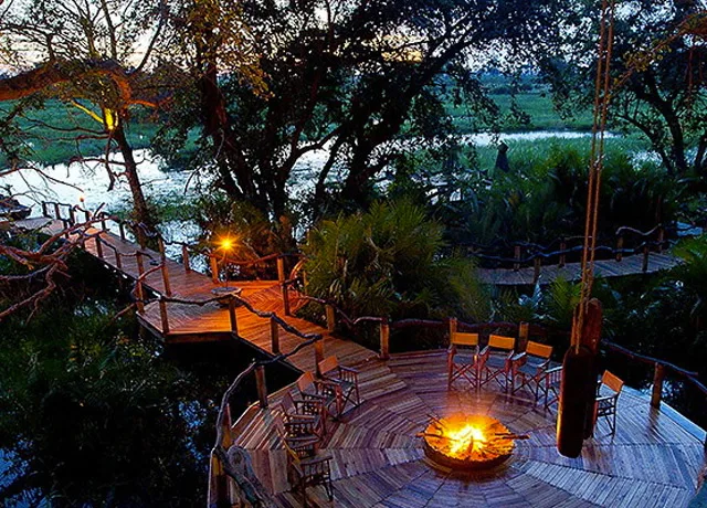 Situated on a private reserve in the heart of the delta on a thickly forested island, five Meru-style tents built on wooden decks sit high on a lush, forested island with views across the floodplains.