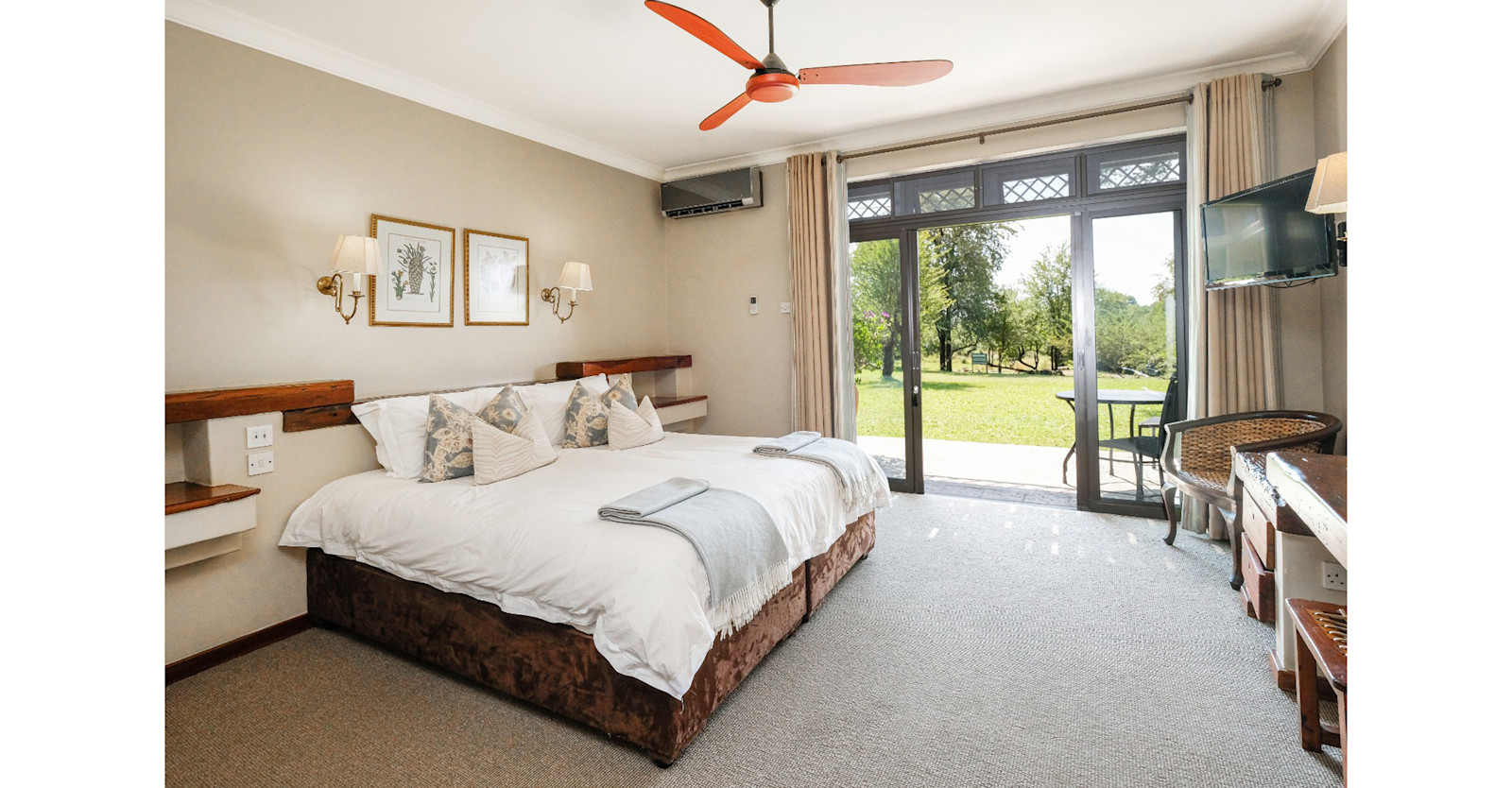 This luxurious boutique hotel enjoys an exclusive setting on the Zimbabwe side of the Zambezi Gorge and Victoria Falls. Geographically, it is the closest accommodation to the falls, which are accessible via an easy walk—as is the town of Victoria Falls—yet guests enjoy peaceful seclusion. Guest rooms on the upper tier open out onto a private balcony, while lower-tier rooms open onto manicured gardens frequented by wildlife that roams the vicinity. Enjoy impromptu entertainment from warthogs, impala and sometimes even hippos that graze on the hotel lawns. Large guest rooms have views either of the spray from the falls in the distance, or of the lush gardens. Each spacious room is a study in style and comfort, and teak furnishings made from railway sleeper cars enhance the distinctive African ambience. Amenities include high-quality linens and towels, air conditioning, ceiling fans, satellite television, free Wi-Fi, hair dryer, complimentary toiletries, refrigerator, tea- and coffee-making facilities and an in-room safe.