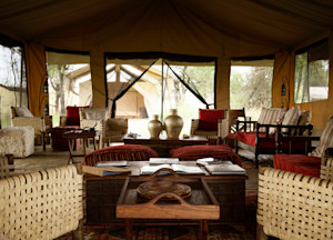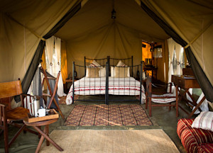 Kimondo is a small mobile tented camp that tracks the seasonal migration of wildebeest from the Lamai Wedge and Mara River in winter to the southern Serengeti grasslands in the height of summer. Constructed of wood and canvas in an exotic blend of vintage East African safari style with subtle Moroccan overtones, Kimondo has eight elegant and airy canvas tents, each with a king-size cast-iron bed, leather folding chairs, wooden writing desk, and en suite bathroom with flush toilet and safari-style shower and private veranda. The central area features a spacious lounge with wooden daybeds, plush cushions and a common dining tent. Before or after dinner, guests can reminisce about the day’s sightings over drinks around the campfire.