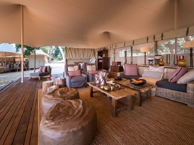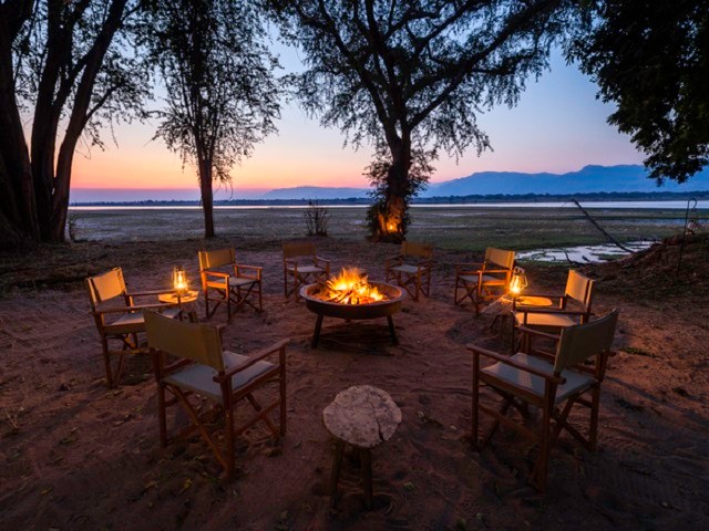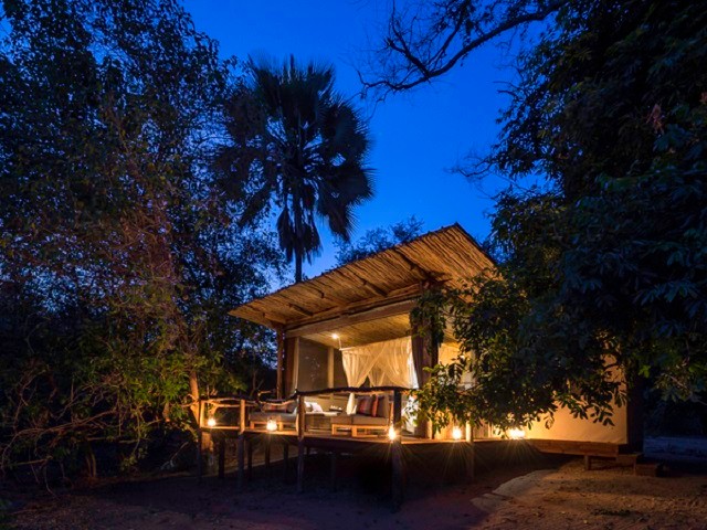 Surrounded by the natural beauty of Mana Pools National Park, Little Ruckomechi provides unmatched exclusivity. Located within the private Ruckomechi Concession, this intimate camp offers just four canvas tents shaded by albida trees along the Lower Zambezi River. Each tent rests on a low wooden deck with a private veranda overlooking the river and visiting wildlife. All tents have an en suite bathrooms with shower, a writing desk and ceiling fan. Elegantly decorated, the tents feature fine linens, wooden tables, upholstered chairs, local artifacts and comfortable beds with mosquito netting. Central areas are covered by draped canvas and open to riverfront views, offering inviting spots for meals and gathering between activities. These cozy social nooks are furnished with natural fiber rugs, wooden coffee tables, upholstered and wicker sofas topped in plush cushions and African carvings. On clear nights, enjoy meals under the stars and a pre- or post-dinner aperitif around a campfire encircled by canvas director's chairs.