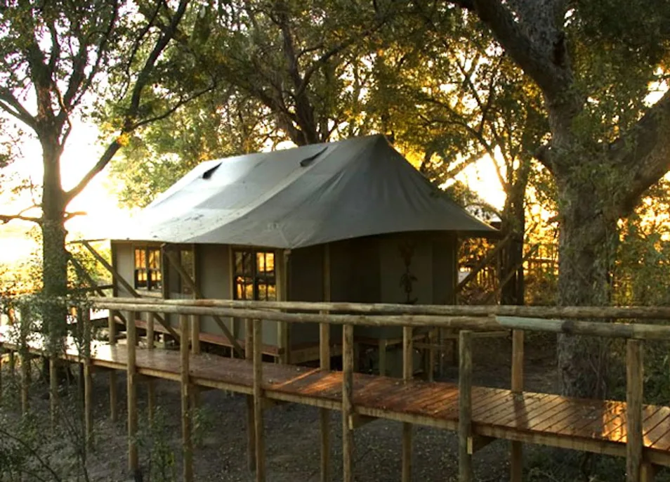 In one of the permanently dry areas of the Okavango Delta on Hunda Island, Tubu Tree's eight traditional canvas tents are built on raised decks, enjoying territorial vistas and passing wildlife.