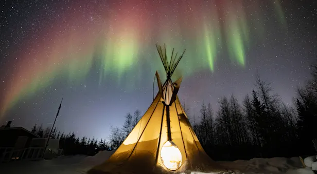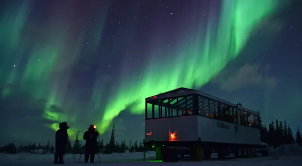 Take a virtual tour of our four aurora viewing locations near Churchill, Manitoba—the Aurora Pod®, Aurora Cabin, Aurora Domes, and a local dog musher's yard with a campfire-illuminated tepee.