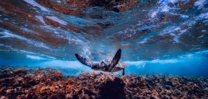 A sea lion swims near the photographer underwater in the Galapagos Islands