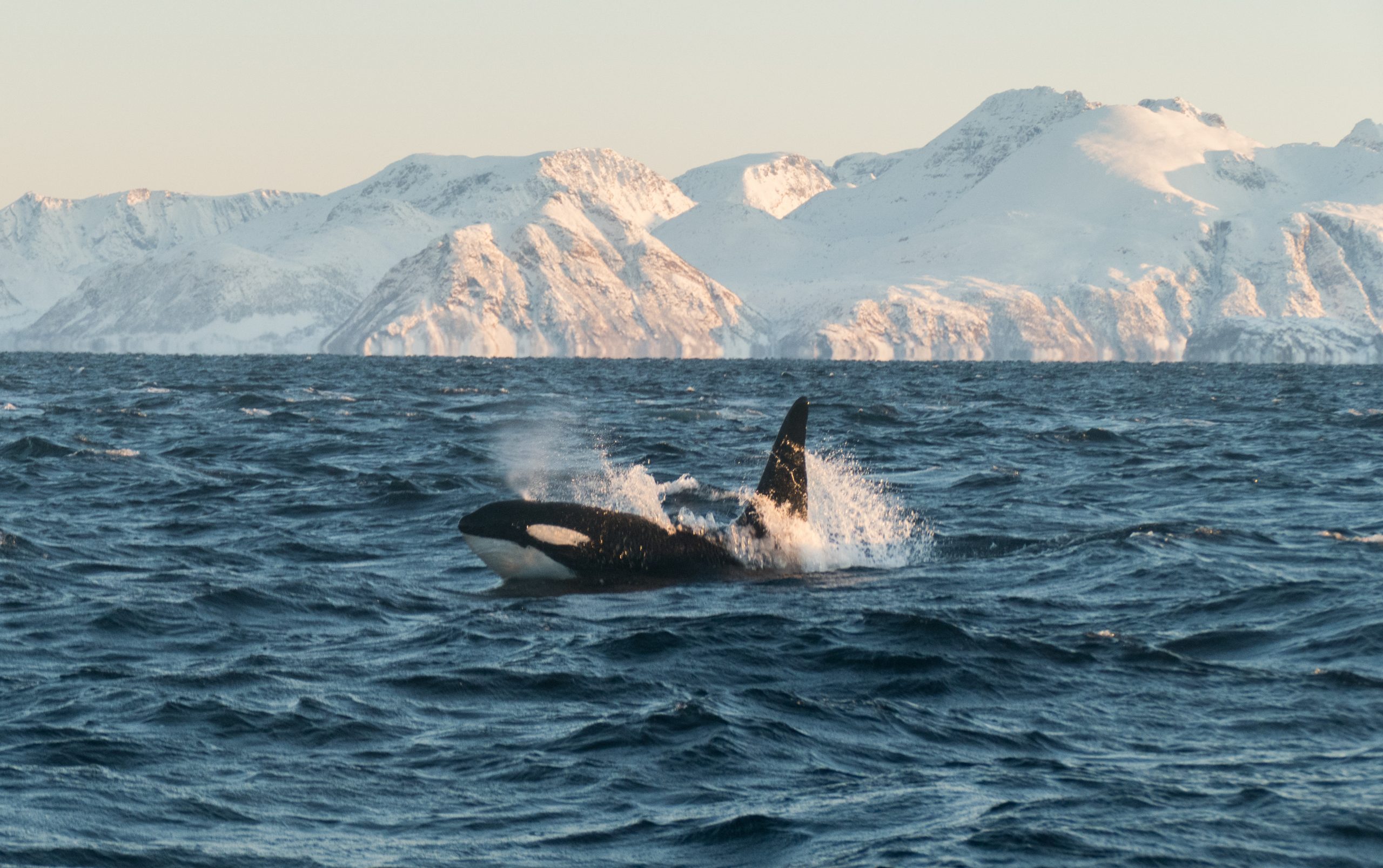 Large male Orca whale surfacing in northern Norway (Orcinus orca/killer whale)