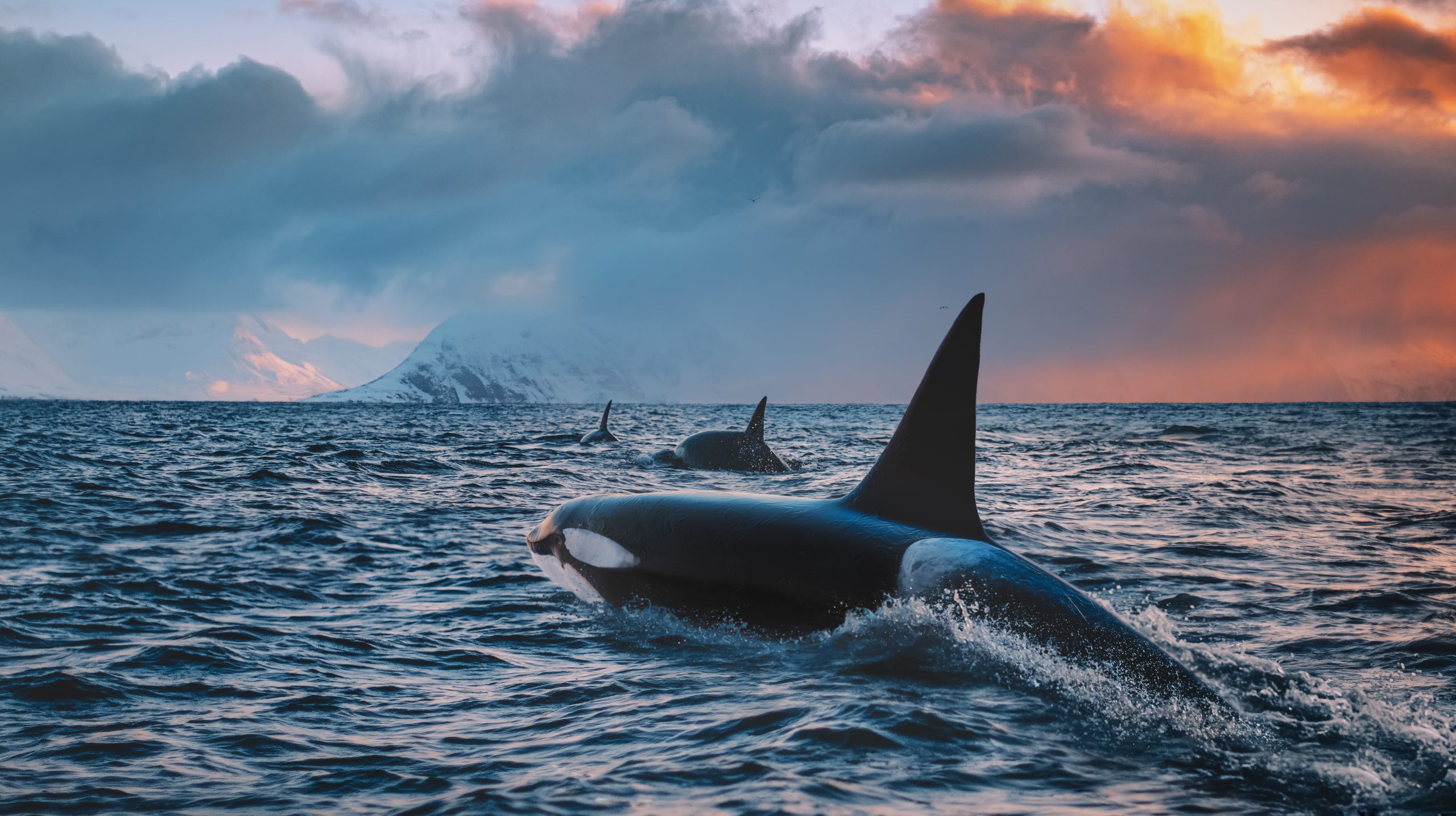 Orca Killerwhale traveling on ocean water with sunset Norway Fiords on winter background