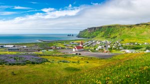 Panoramic view of basalt stacks Reynisdrangar, black sand beach,