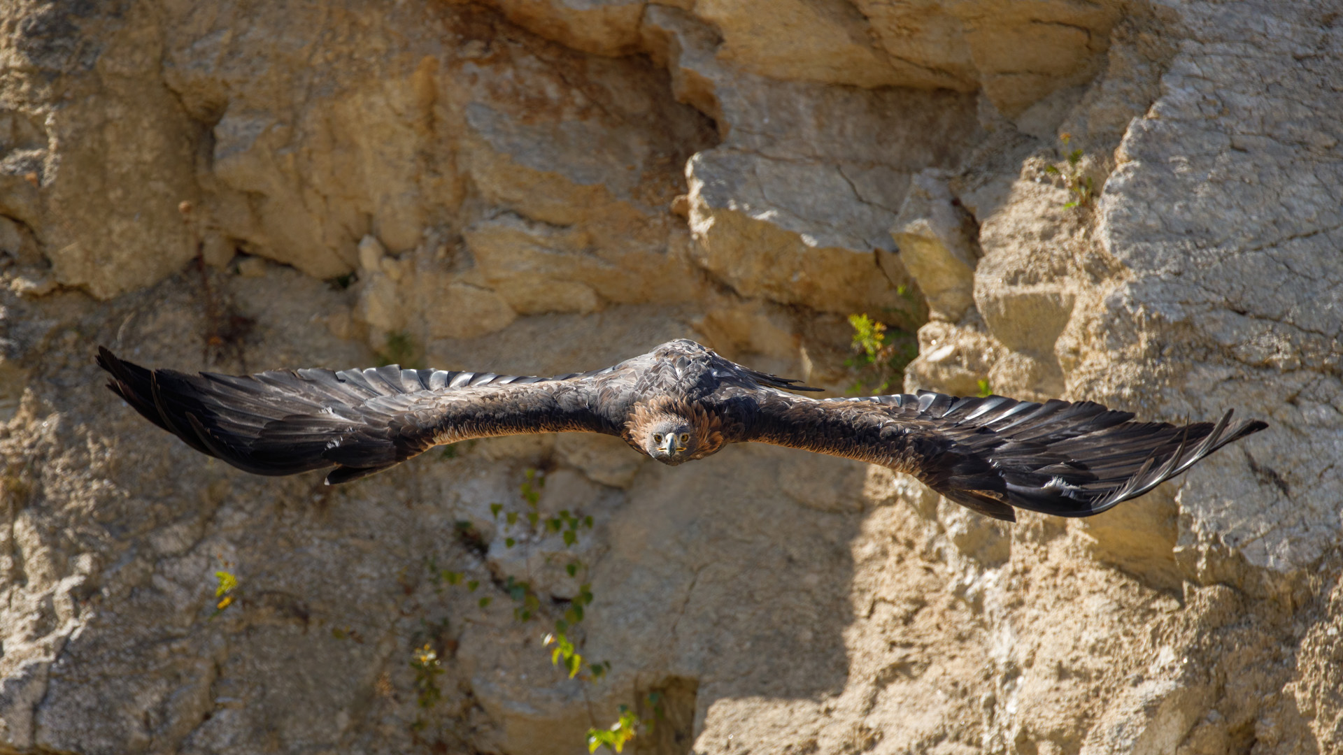 Eagle in flight. Golden eagle, Aquila chrysaetos, glides with widely spread wing down from rock. Majestic bird in beautiful nature. Hunting eagle in mountains. Habitat Europe, Asia, North America.