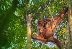 Mother Orangutan (orang-utan) with small baby in his natural env