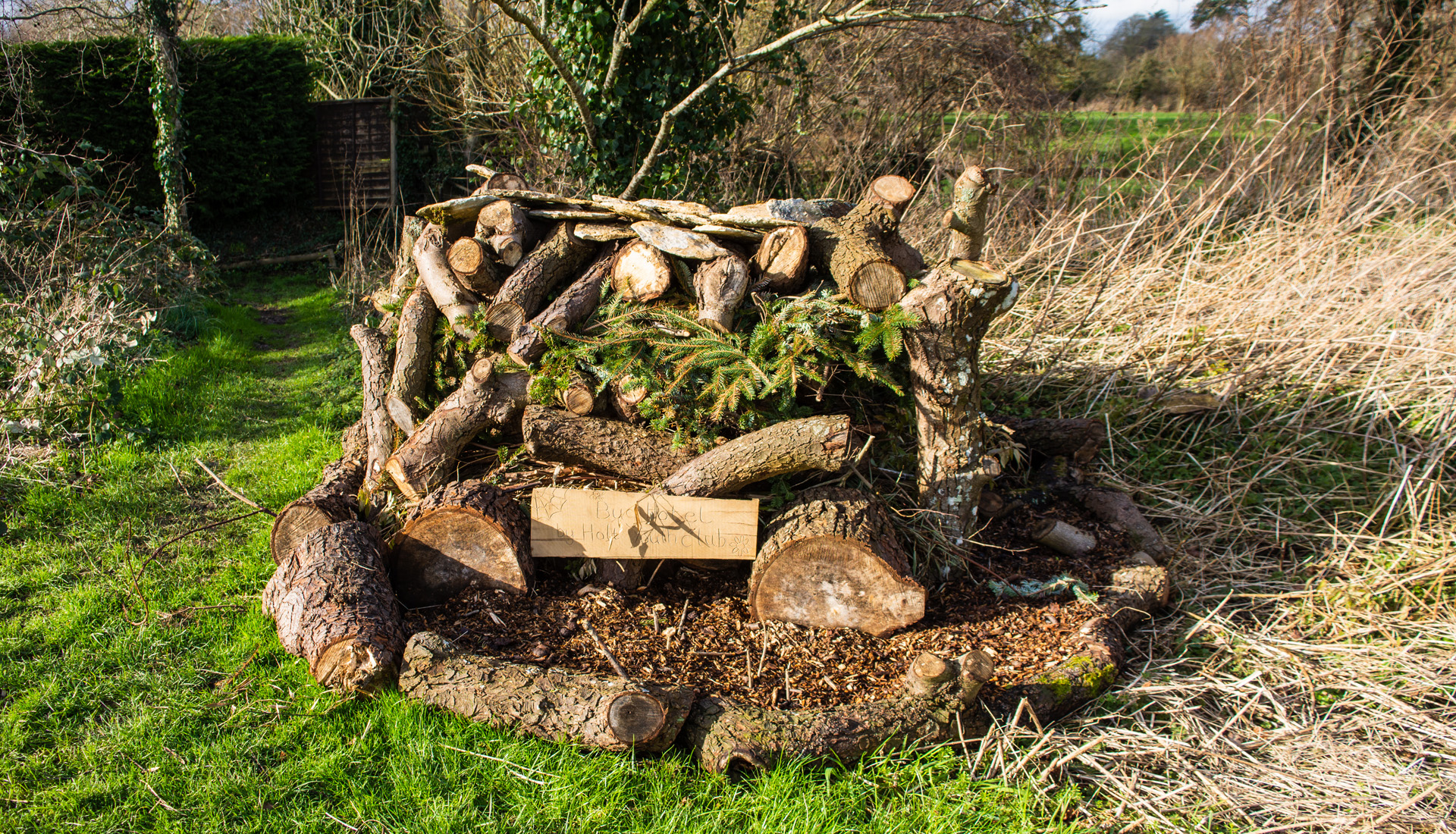 Bug Hotel. A construction of logs, branches and woodchips made by a local youth club to provide a suitable environment for wild insects in Holt Wiltshire