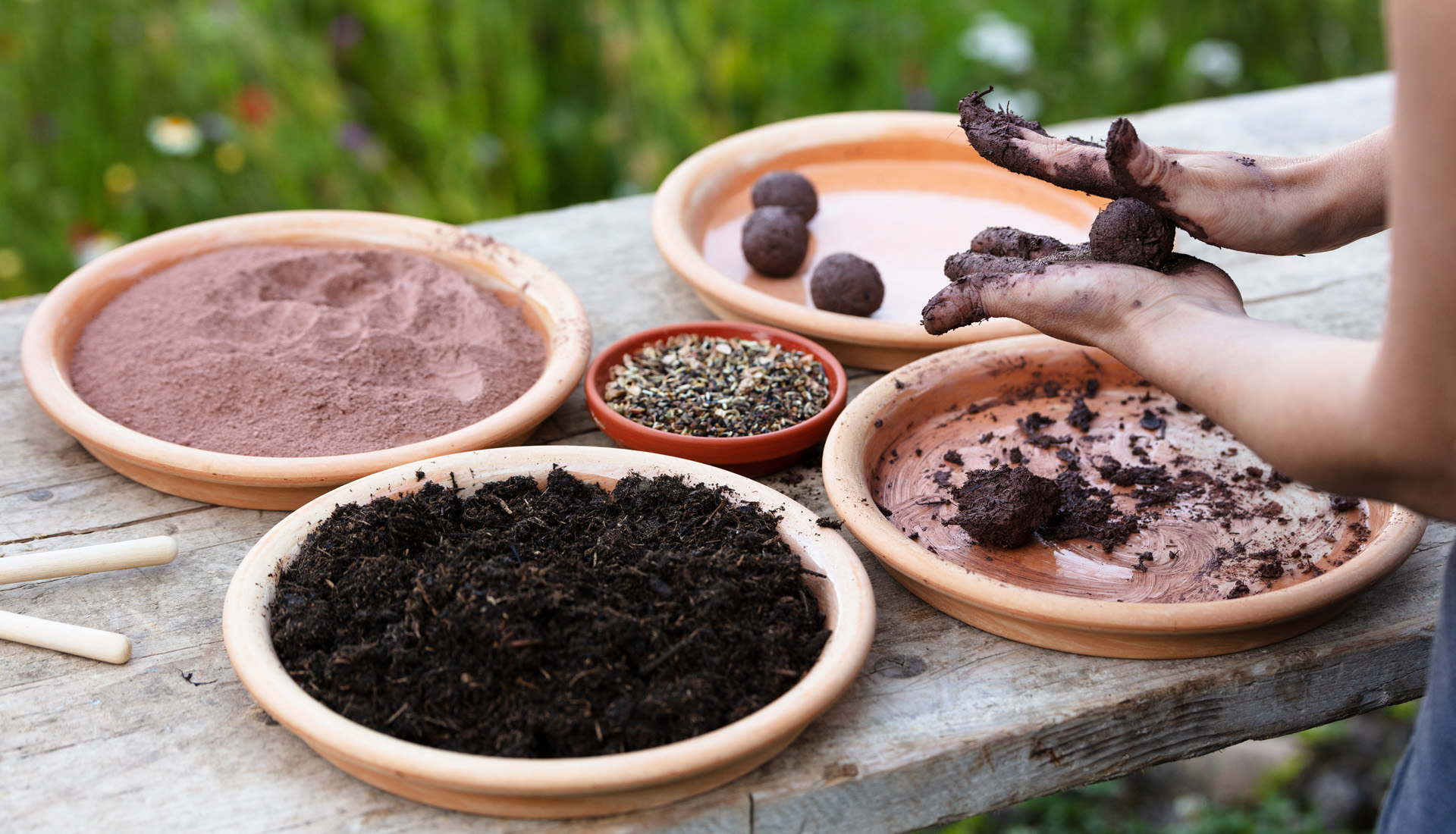 woman is manufacturing seed balls or seed bombs on a wooden table, flower field in the background