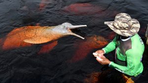 feeding pink dolphins in an ecopark on the Amazon river in Brazi