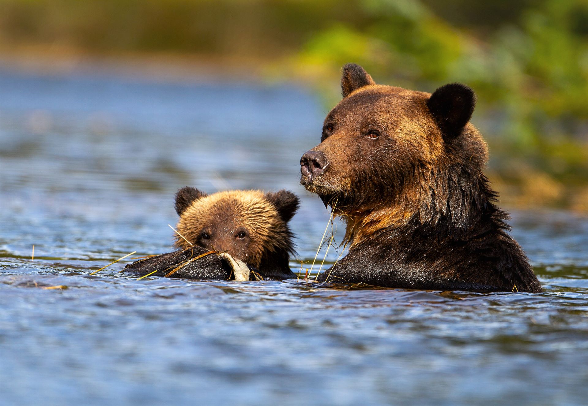 Two bears in the water (a mother bear and a little bear) in the Great Bear Rainforest
