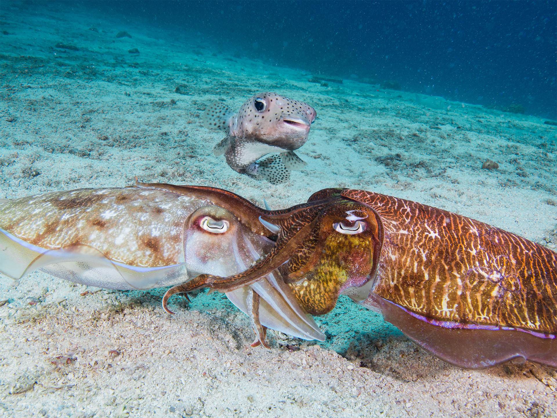 Pharao Cuttlefish mating on a coral reef