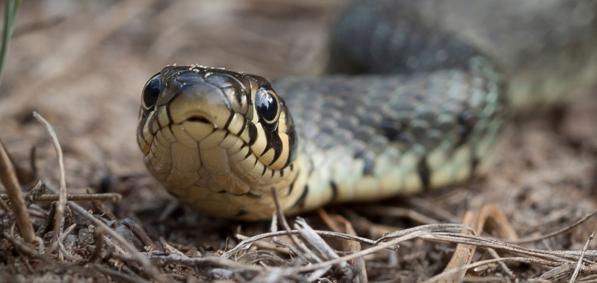 Snakes are an example of an animal that practices “jaw listening.” Snakes rest their lower jaws on the ground to detect vibrations from predators or prey, relying on this behavior for stereophonic hearing. ©Lima_84/Shutterstock.com