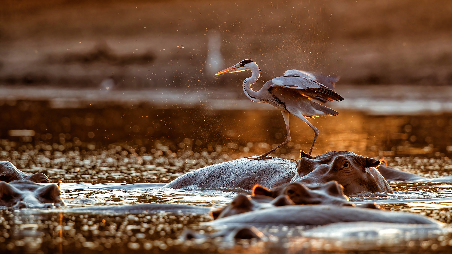 Grey heron (ardea cinerca) fishing from the back of a hippopotamus in a lake with back lit in Mana Pools National Park in Zimbabwe