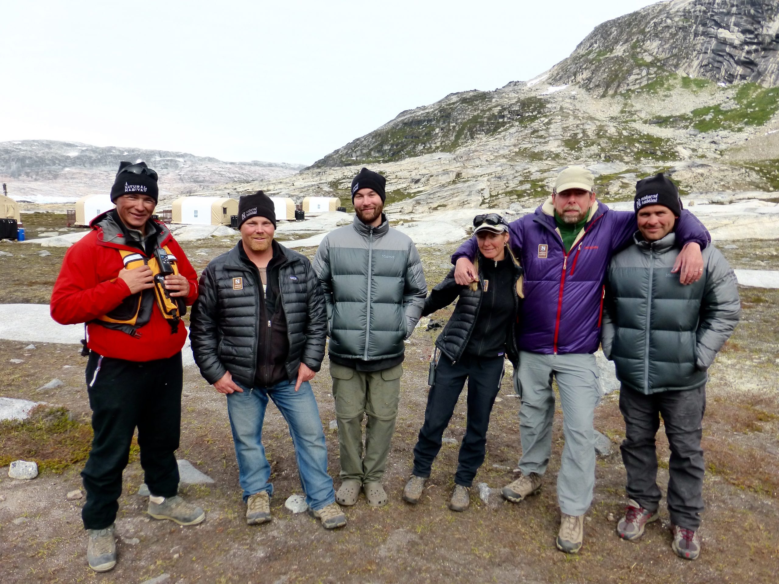 Some of the intrepid Base Camp staff with Greenland Expedition Leaders Melissa Scott and Eric Rock. Left to Right: Julius Nielsen, Jason Luoma, Shane Katsuno, Melissa & Eric, Hoskuldur Jonsson