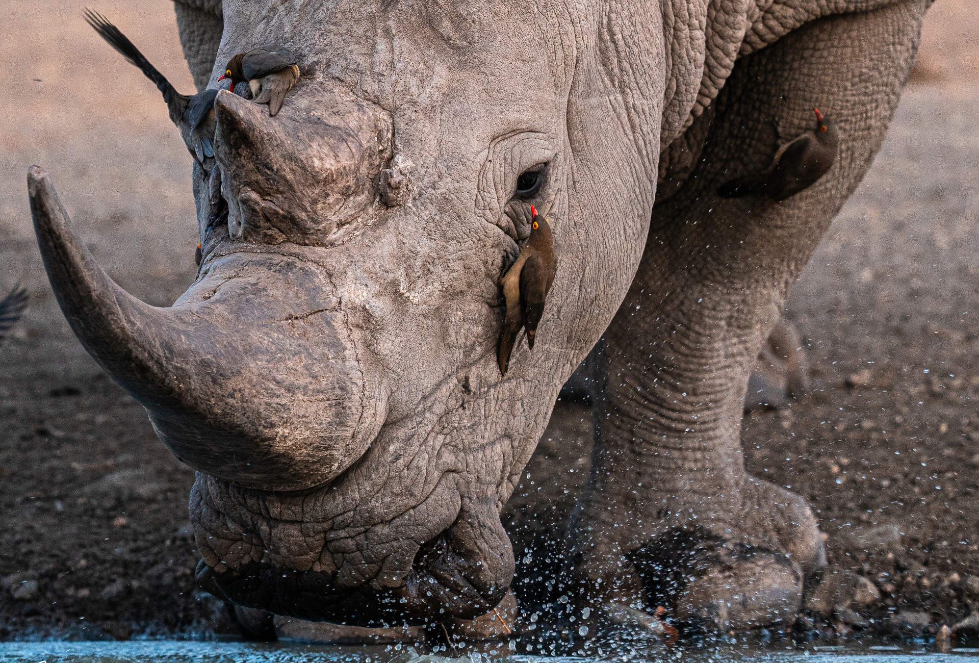 oxpeckers climbing on rhino in africa