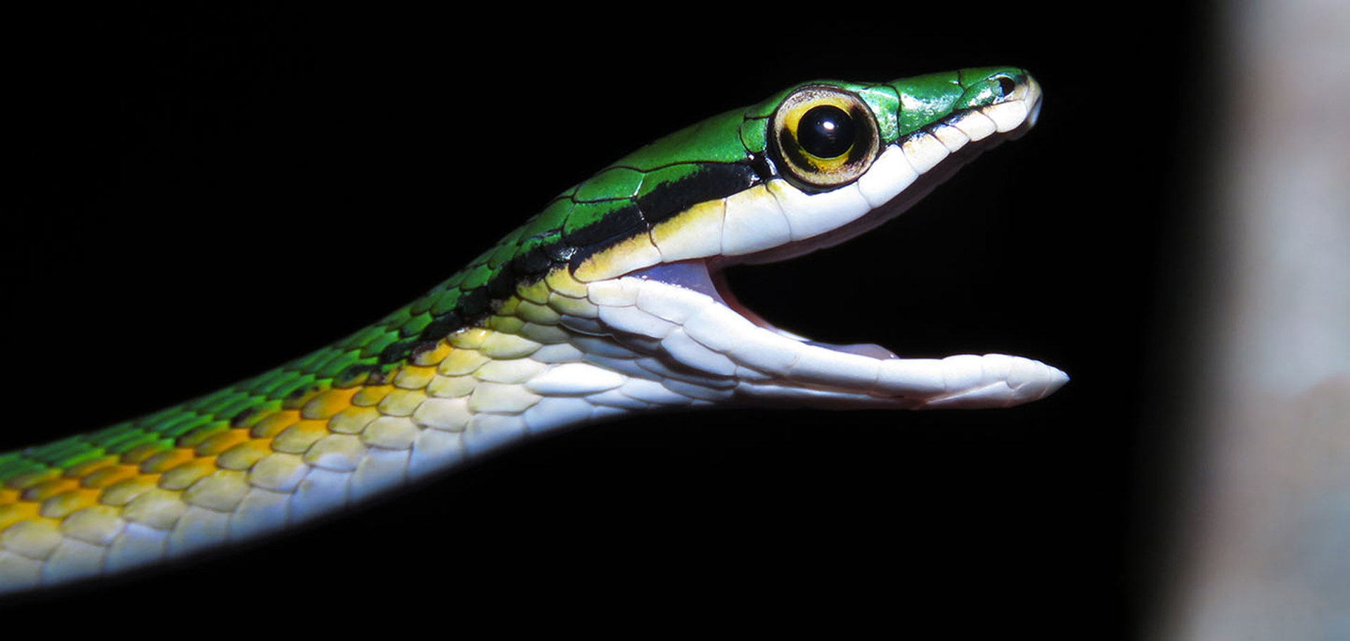 “Leptophis mystacinus,” a type of parrot snake, was recognized as a unique species in January 2025. Growing up to 34 inches long, it is arboreal, nonvenomous and may be endemic to Brazil’s Cerrado, a shrinking tropical savanna. ©N. R. Albuquerque, R. H. Martins, P. S. Carvalho, D. B. Shepard & D. J. Santana, Wikimedia Commons