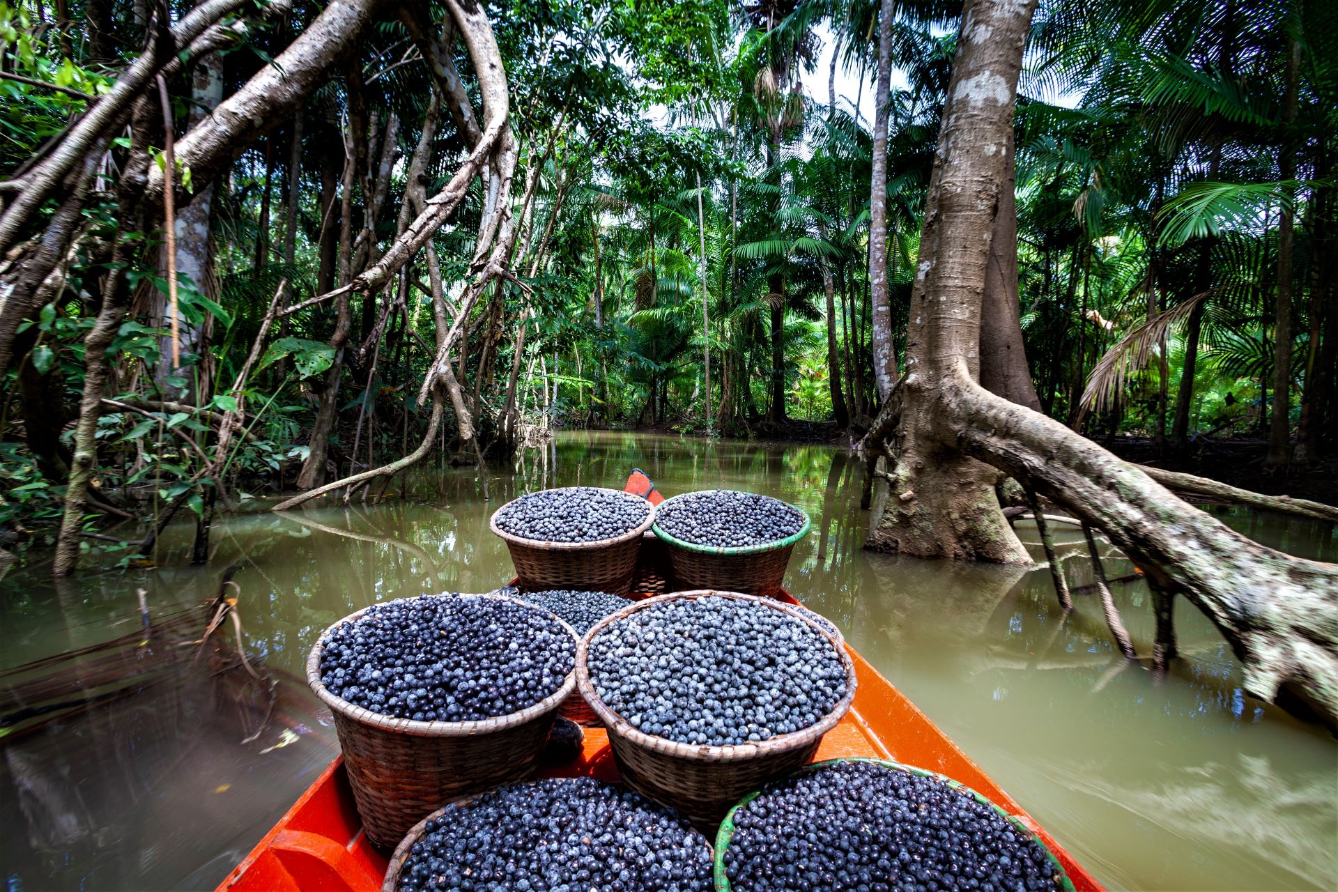 Fresh acai berries fruit in straw baskets in red boat and forest trees in the Amazon rainforest.