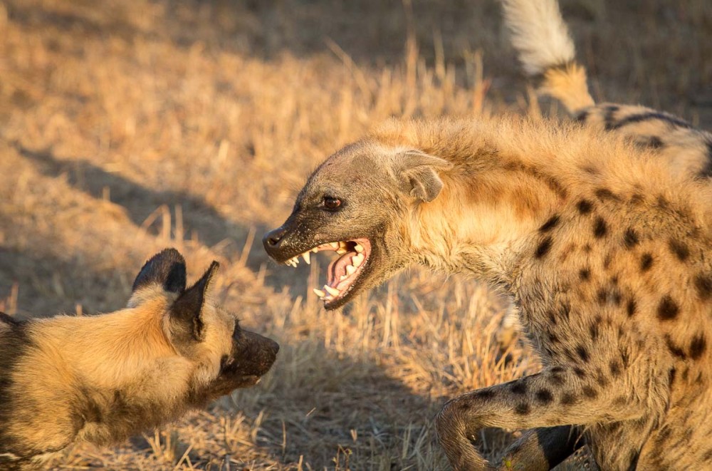 Sabi Sabi guide Kosie Lategan captured this dramatic image of a wild dog and a spotted hyena squaring off over a kill. He wrote about the age old rivalry between the species recently on Sabi Sabi’s blog. Interestingly, wild dogs, in spite of a marked size disadvantage, more often than not come out on top in conflicts with hyenas because of their usually superior numbers and ability to work as a team. As you can see in this photo, the hyena looks pretty agitated, while the dog seems calm. You can read the full story and watch some great video footage of hyena/wild dog conflicts here.