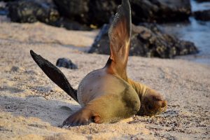 A sea lion swims near the photographer underwater in the Galapagos Islands