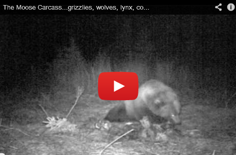 In September of 2009 I got a call from a neighbor friend who knows which trails I frequently hike with my wife. On one of these trails a neighbor had shot a moose to stock up on a winter’s supply of meat. As usual, he carried out only the edible portions of the animal, leaving some of the bones, hide and organs. This “gutpile” as it is called, was right off the trail, and would likely attract grizzly or black bears. I have spent far more than my share of time around bears and I know all too well that you never want to invade the space of a bear who has found a major food source like a gutpile. Despite my better judgment, within 5 minutes I had grabbed a bear deterrent flare (just in case) and my trustee wife and assistant Melissa (who wasn’t really keen on the whole idea) and headed out to put up my game camera on the nearest tree, hopefully before the bears got there.