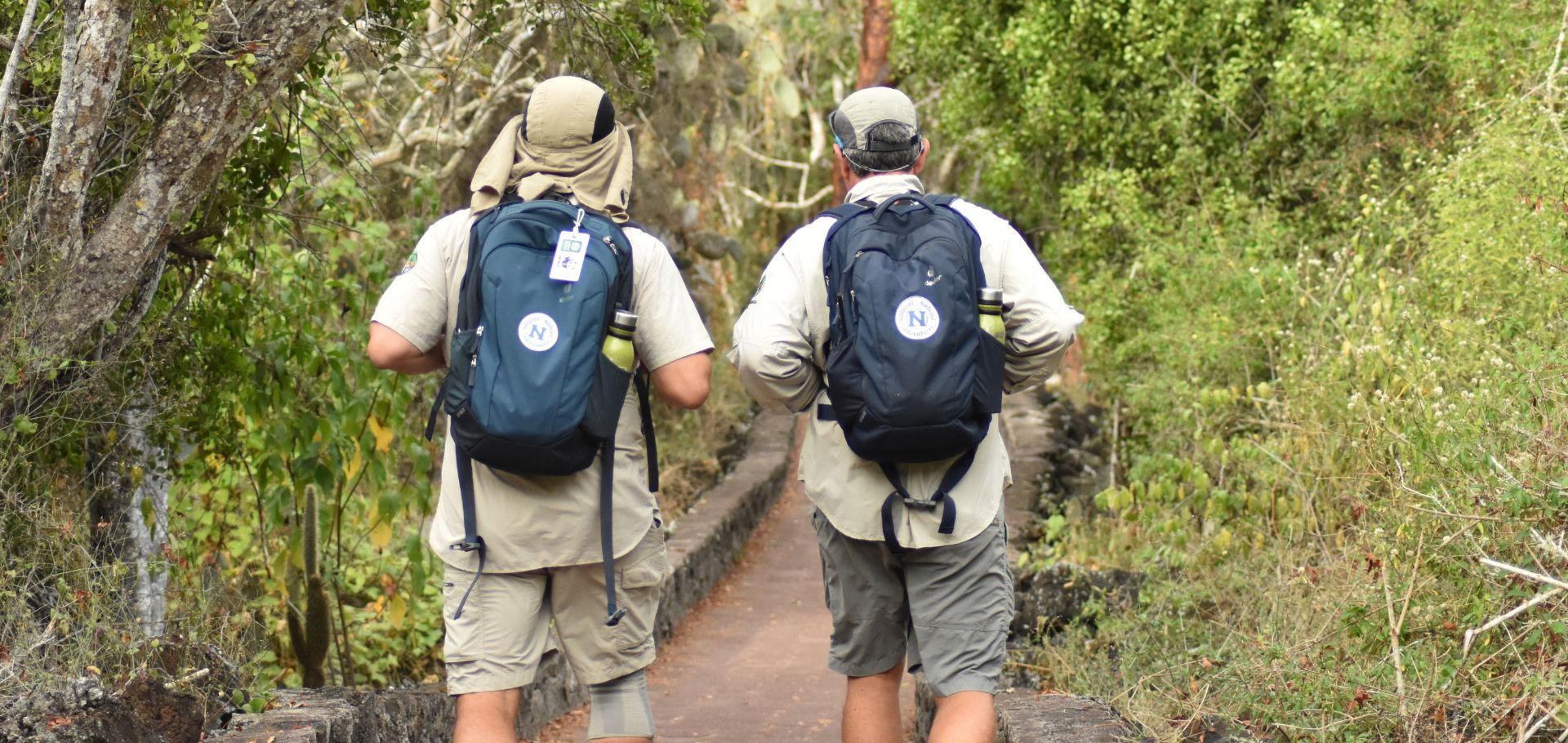 Two travelers in the Galapagos walking through greenspace