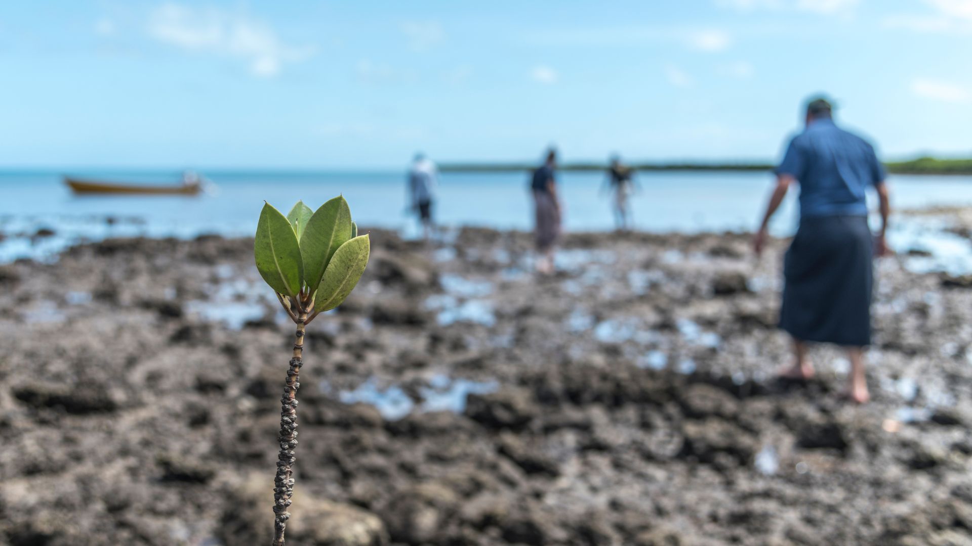 WWF staff walking to a long boat after visiting a small area of mangrove resforestation on Mali Island. Macuata Province, Vanua Levu, Fiji.
