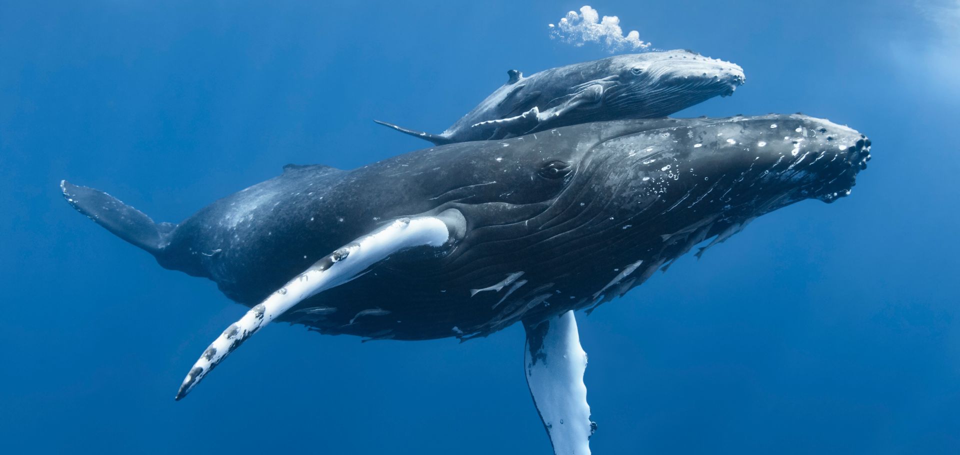 Humpback whale (Megaptera novaeangliae) calf 'Tahafa' male with injured pectoral fin and scarred body, with mother. Vava'u, Tonga, Pacific Ocean.