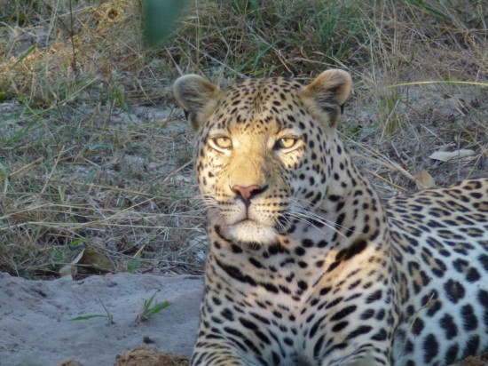 And indeed it was, lounging alongside the road not 8 feet away, the sun’s sinking rays illumining its regal face. The leopard remained still, as we captured amazing photographs. Eventually it rose and sauntered toward a small mopane tree a few feet away, putting on quite a show for us as it rose onto its haunches and began scratching its front paws and upper body against the tree trunk, a means of marking its territory.
