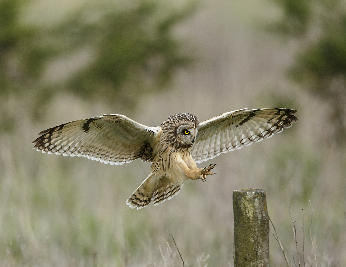 This week we chose a short eared owl coming in for a landing on a post in England.