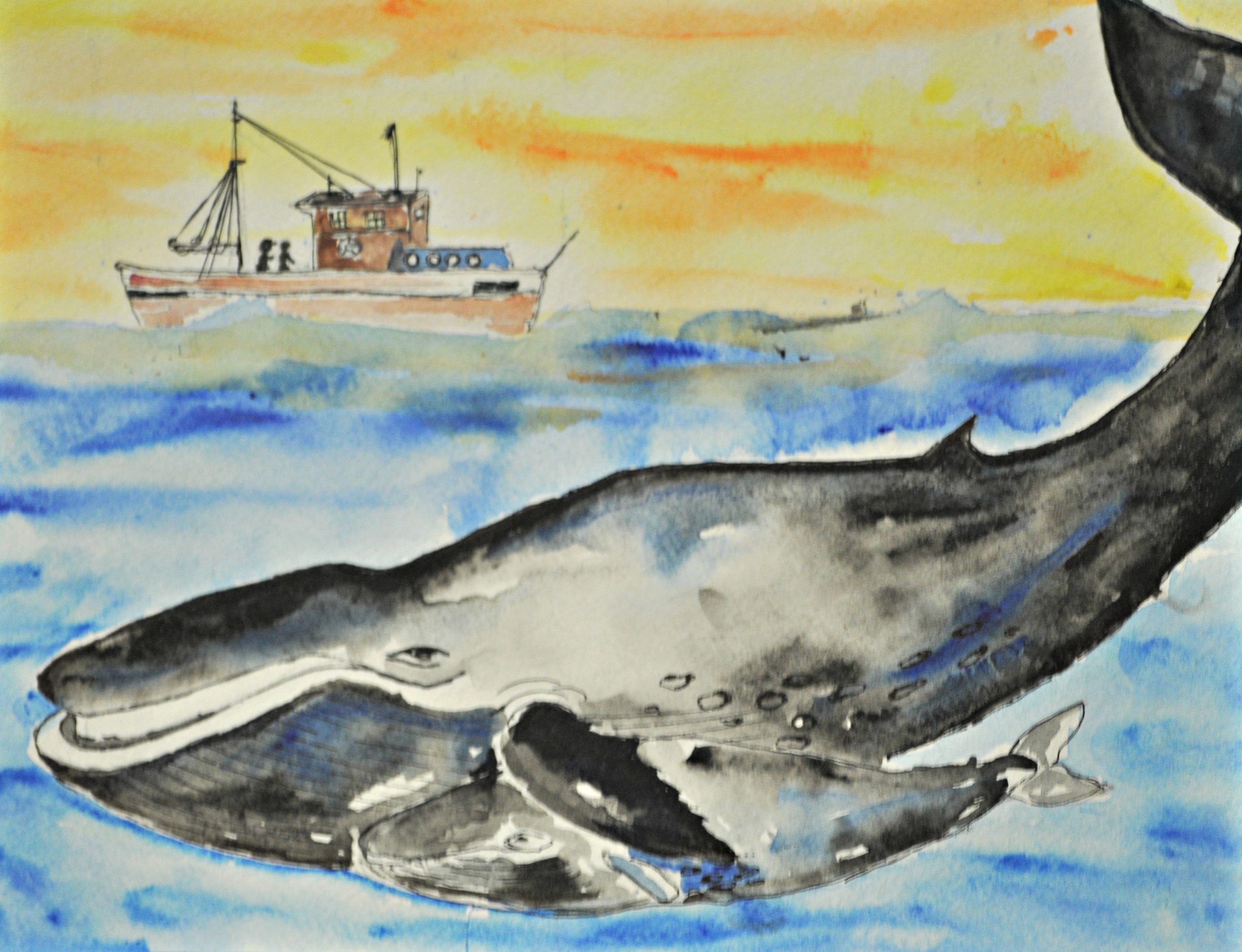 1st Place for grades 3-5: Anisha Kundu’s serene watercolor painting of a Humpback Whale.