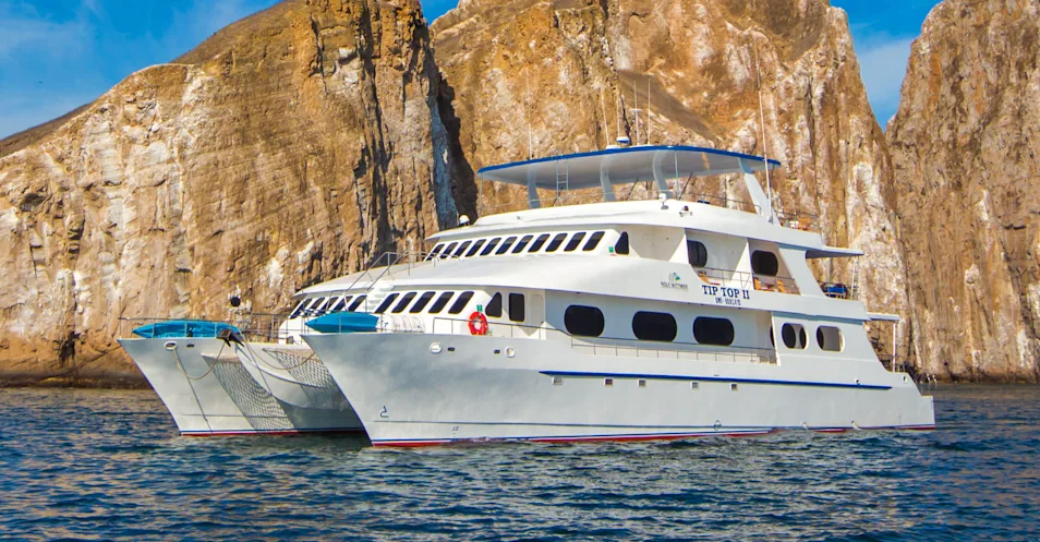 The 104-foot-long Tip Top II is a first-class motor catamaran built for cruising the Galapagos Islands. A spacious interior accommodates up to 16 guests in nine cabins, across two decks.