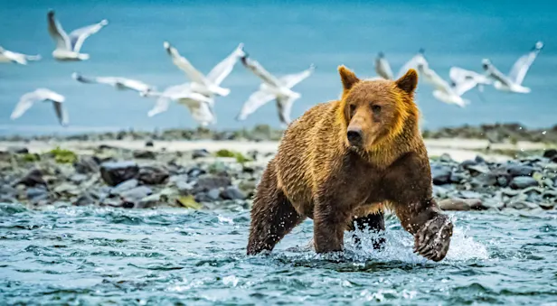 An exclusive small-ship adventure to view giant brown bears—the world's largest "coastal grizzlies"—up close! Walk the shores as bears dig for clams, forage for sedges and pursue salmon in season in tidal streams.