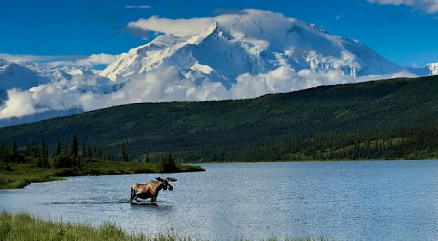 In Denali, travelers may spot Alaska’s “Big Five”: moose, caribou, Dall sheep, wolves and grizzly bears. Clear days reveal dramatic views of Denali rising high above the Alaska Range, while the park’s remote backcountry invites exploration on foot or by air.