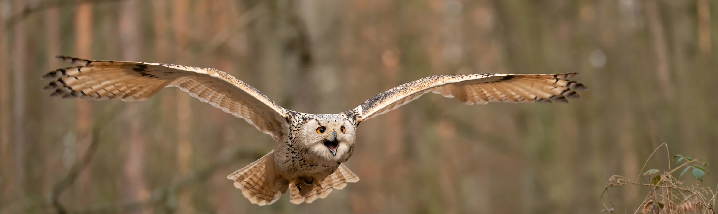 Recognized by their bright orange eyes and ear tufts, patterned brown feathers and light underparts, an eagle owl’s wingspan can stretch over 6 feet.