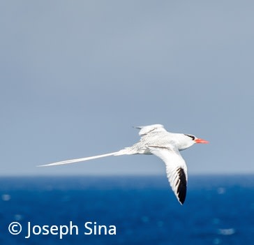 The unmistakable red-billed tropicbird is one of the most impressive of the Galapagos seabirds. The most noticeable feature of this splendid white bird is its pair of long tail streamers—two elongated feathers often as long as the rest of the body. The birds are 2.5 feet long (including the tail feathers) and have a wingspan of just less than 3.5 feet.