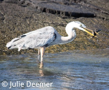 Though called ‘blue,’ this heron, the biggest in the Galapagos with a 6.5-foot wingspan and 4.5-foot-long-body, is actually a largely gray bird readily identified by its lengthy legs and pronounced size. Similar to many herons, the great blue typically stands with its head stooped over toward its shoulders, a position it sustains while flying, with its elongated legs trailing behind.