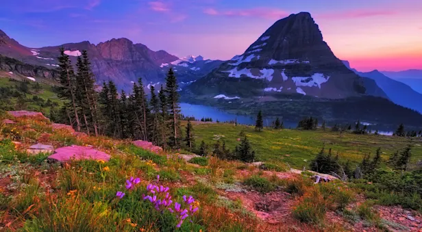 In Montana, beargrass and fields of glacier lilies dot the foreground, while mighty glaciers and rugged pewter spires reach for the skies.